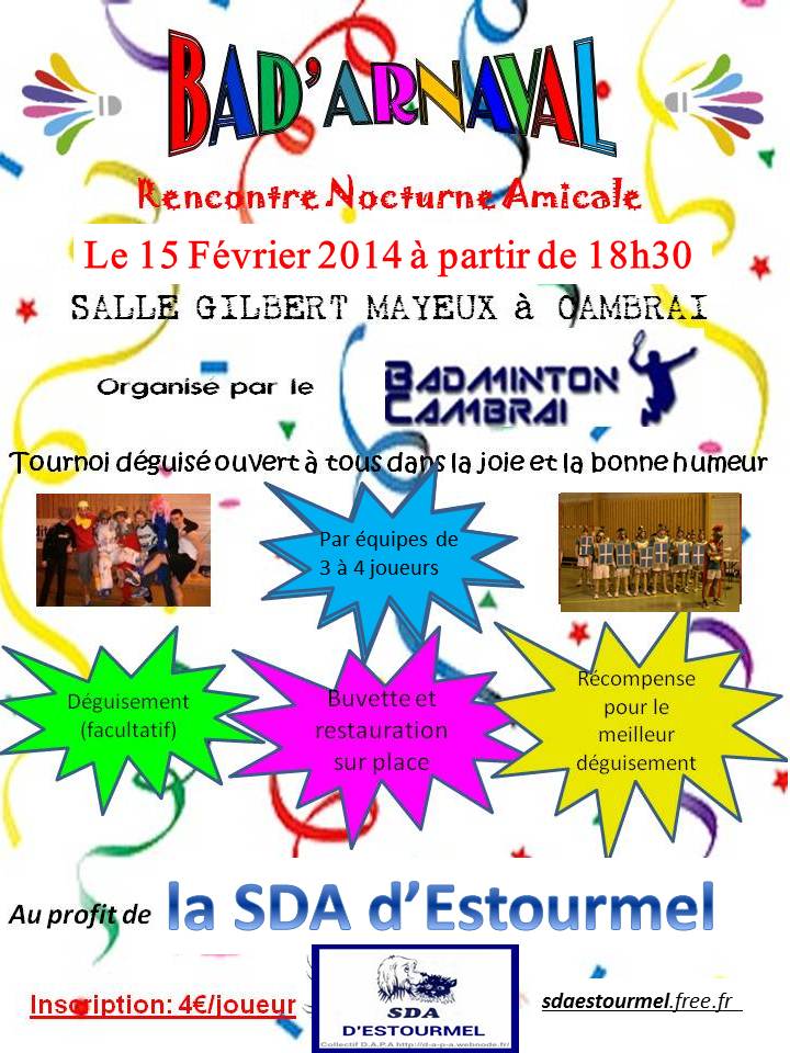le Badminton Cambrai vous invite pour son traditionnel tournoi loisir déguisé « BAD’ARNAVAL » qui aura lieu le Samedi 15 Février 2014 à partir de 18h30 au Gymnase Gilbert Mayeux.